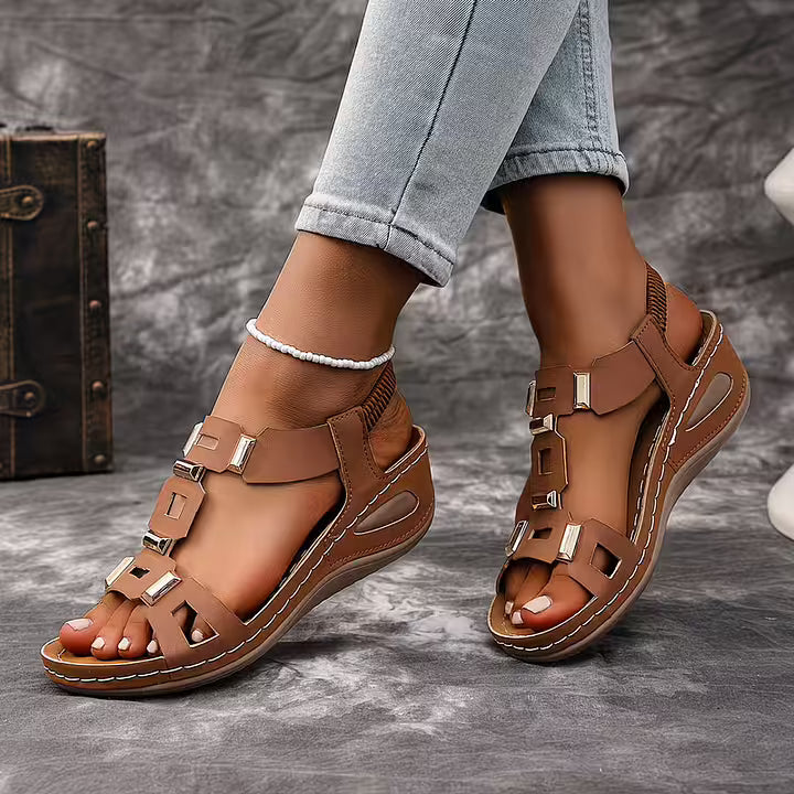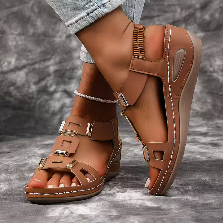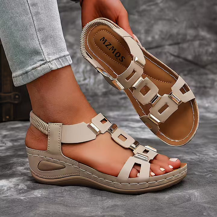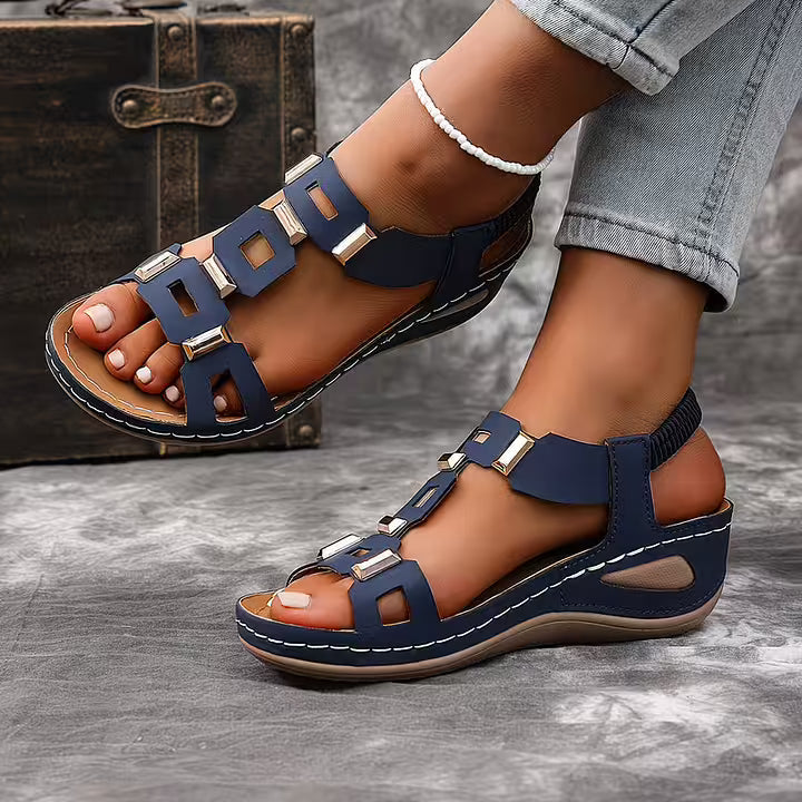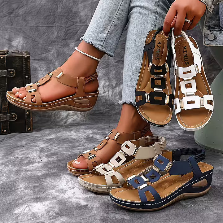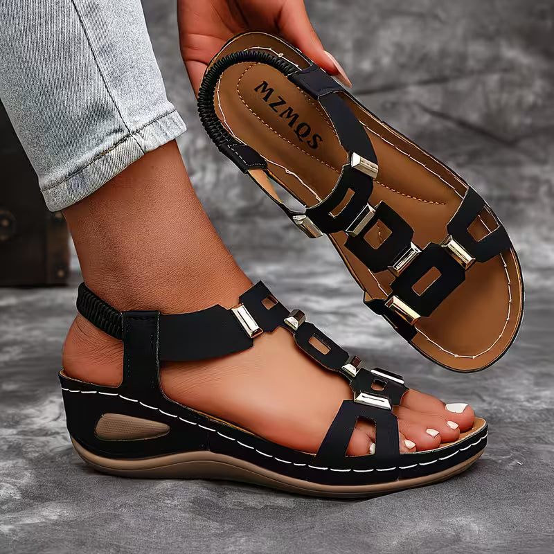 These open toe sandals feature a structured multi-strap upper accented with metallic details for a bold finish. The slingback construction and supportive sole create a balanced silhouette suited for daily wear, travel, and warm-weather styling.