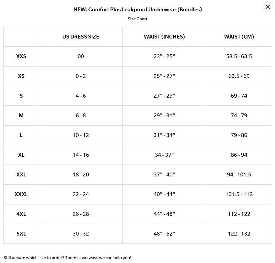 A: Our underwear fits a little large. If in between sizes, we recommend ordering a size down. If you're still unsure, you can order confidently knowing we have our perfect fit guarantee - if the size you order doesn't fit, we'll get you the correct size 100% free!